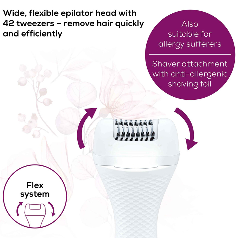 - Wide, flexible epilator head with 42 tweezers to perfectly fit the contours of the body